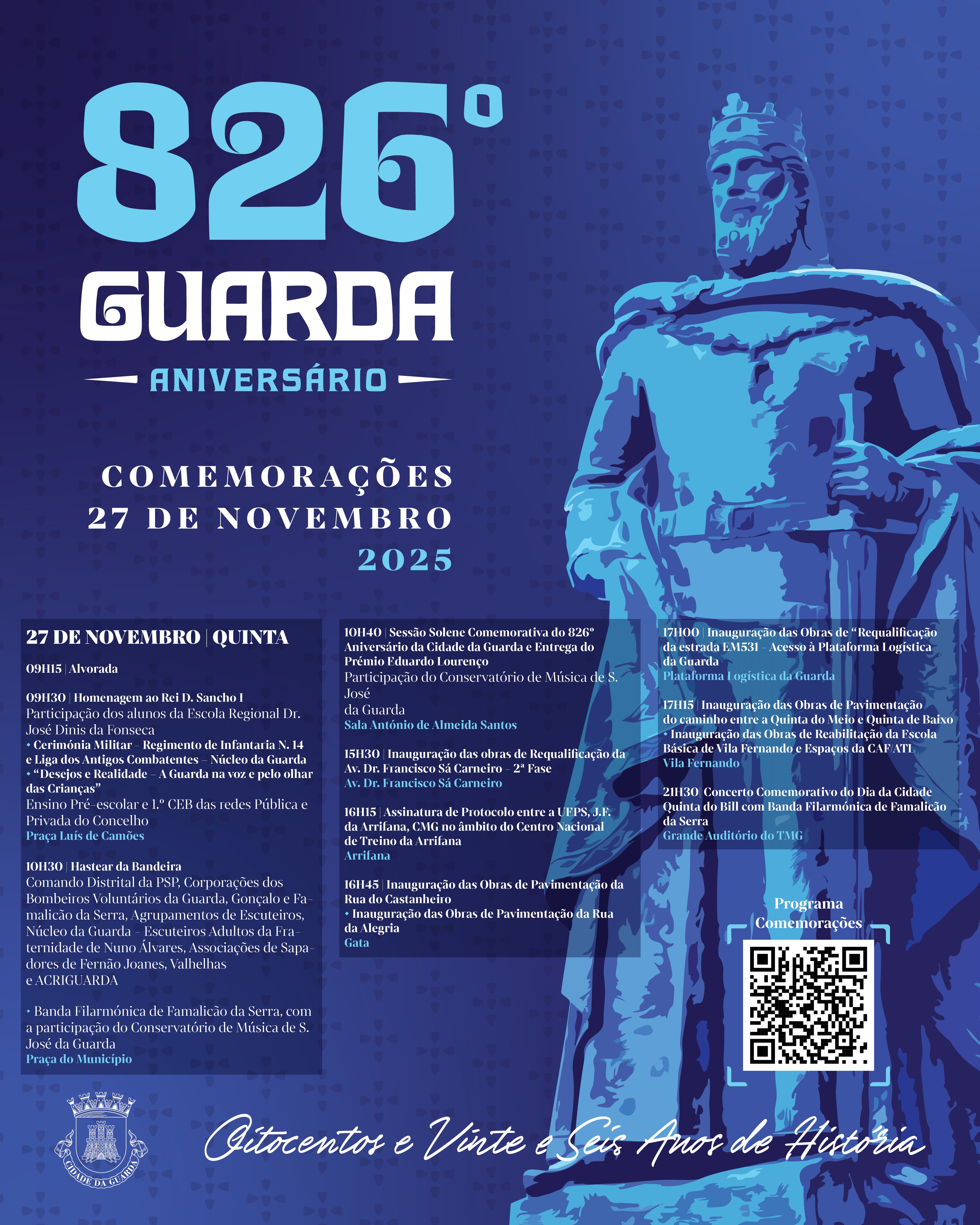 Para celebrar a atribuição de foral à Cidade pelo rei D. Sancho I em 1199, o Município da Guarda preparou um vasto programa de que se destaca a entrega do Prémio Eduardo Lourenço 2025 atribuído este ano ao cardeal, poeta e teólogo José Tolentino de Mendonça, a assinatura de protocolo com a Unidade de Emergência de Proteção e Socorro (UEPS), para a construção do Centro Nacional de Treino da UEPS, na Arrifana, o concerto dos Quinta do Bill com a Banda Filarmónica de Famalicão da Serra. Serão ainda inauguradas diversas obras na cidade e no concelho, intervenções importantes para a mobilidade e qualidade de vida das populações.