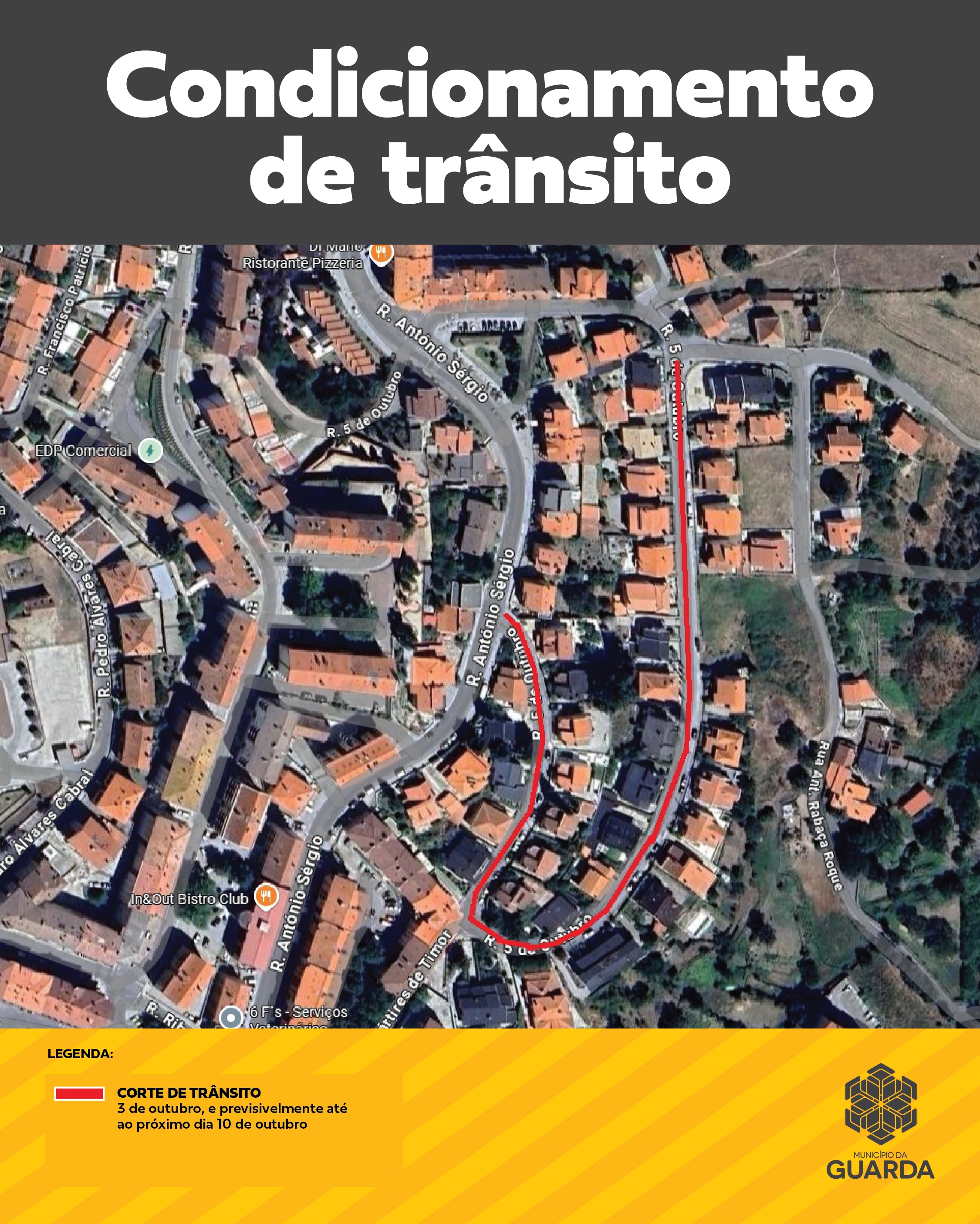 Aviso | Corte de trânsito a partir de 3 de outubro | Rua 5 de Outubro - Guarda