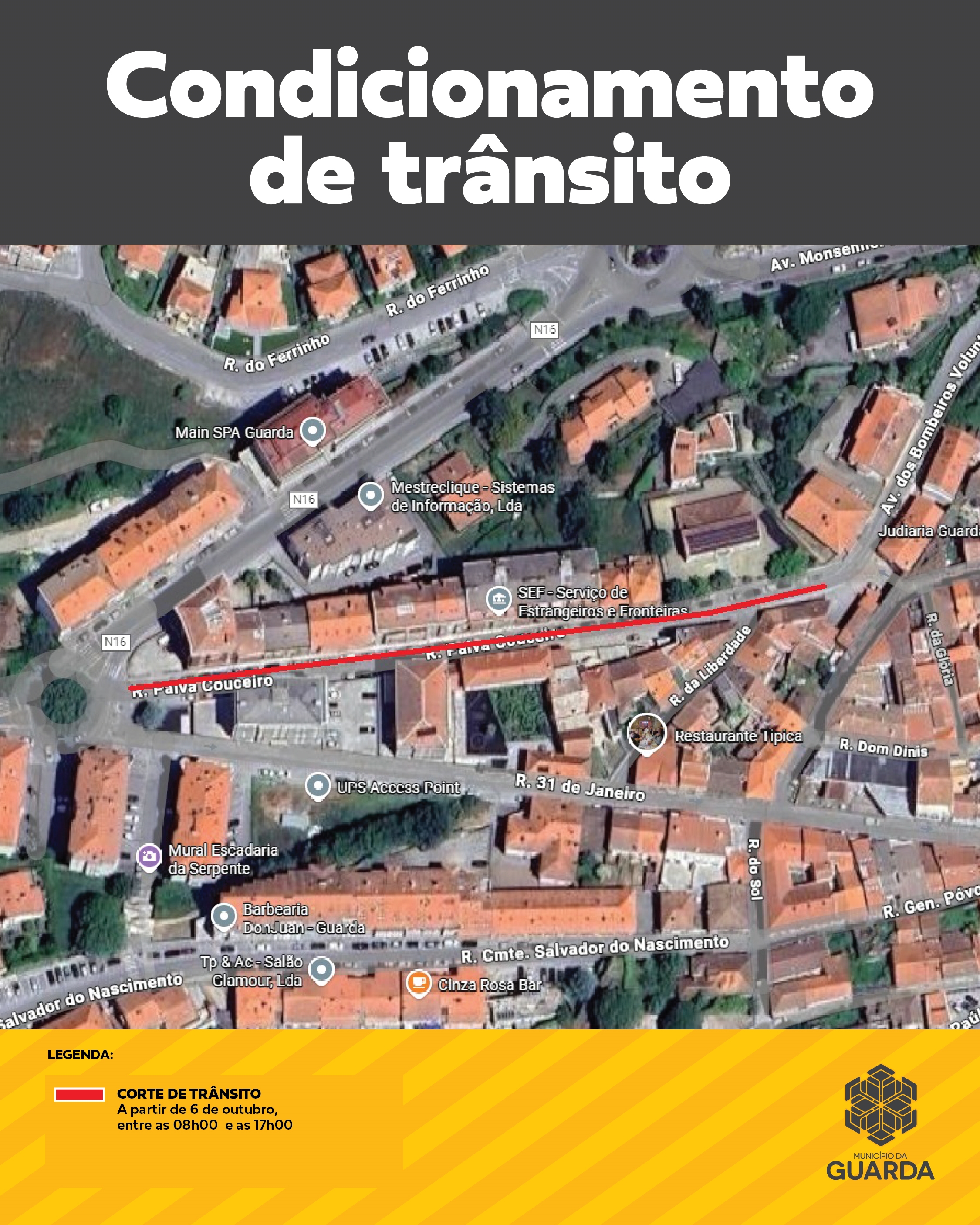 Aviso | Condicionamento de trânsito e supressão de estacionamento - a partir de 6 de outubro | Rua Paiva Couceiro - Guarda