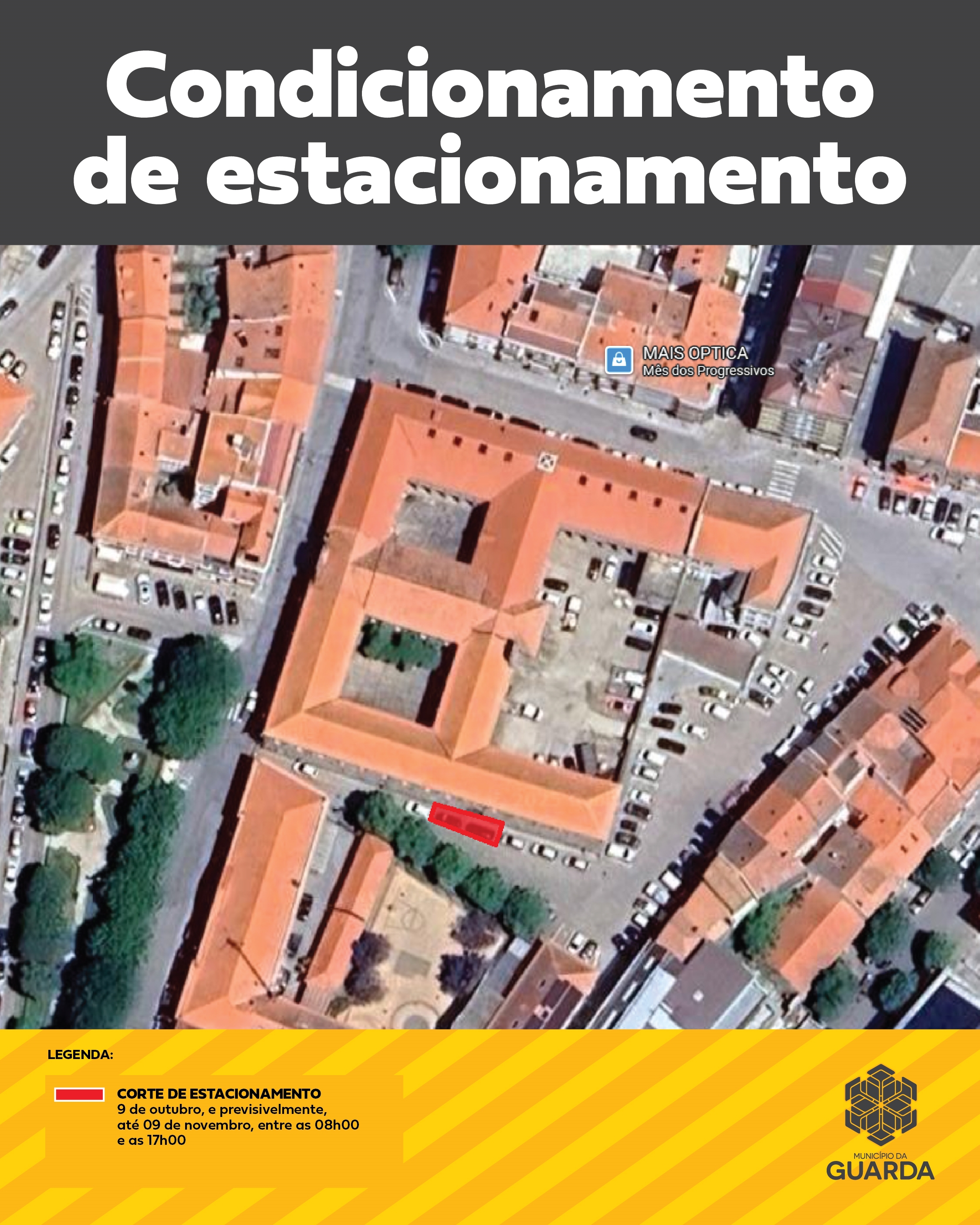 A partir de amanhã, 9 de outubro, e previsivelmente, até 09 de novembro, entre as 08h00 e as 17h00, torna-se necessária a ocupação temporária de dois lugares de estacionamento, junto ao edifício do Museu – Largo João de Deus, por forma a efetuar, em segurança, trabalhos de limpeza/ substituição da cobertura, no âmbito da Empreitada 'Reparação dos danos provocados pelas cheias e inundações registadas nos meses de dezembro de 2022 e/ou janeiro de 2023 no Município da Guarda – Edifícios e Construções Municipais – 1ª Fase'. Solicita-se especial atenção para a sinalização temporária implantada no local.