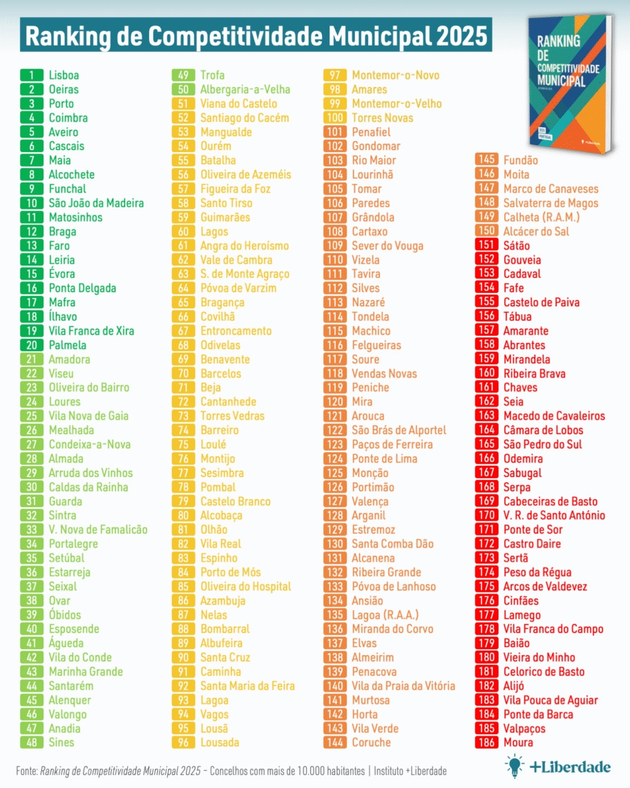 O índice compara a atratividade e qualidade de serviços e infraestruturas dos 186 municípios que têm mais de 10 mil habitantes em Portugal. Como sublinha o Instituto Mais Liberdade, o objetivo deste ranking é oferecer informação clara e comparável para famílias, empresas e decisores públicos, evidenciando padrões, boas práticas e fragilidades a nível local. Procura-se assim estimular o desenvolvimento de cada município e valorizar aqueles que apresentam melhores indicadores em cada dimensão de análise.