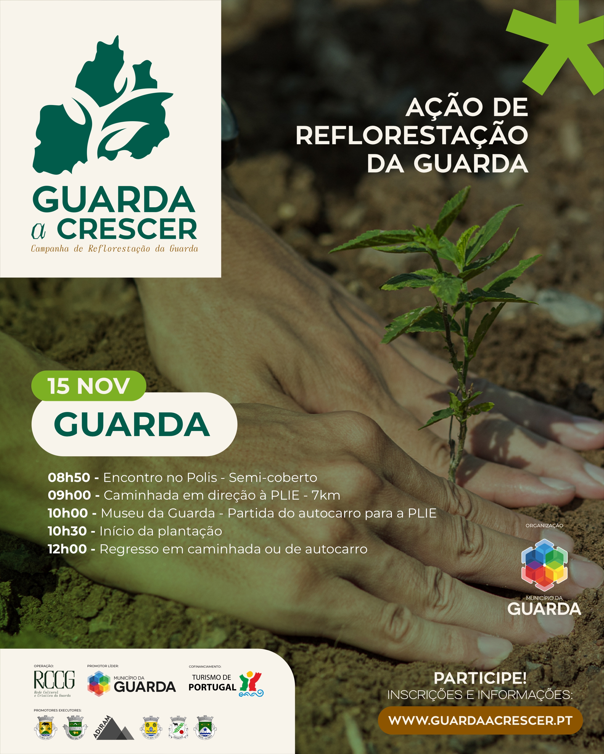 Esta ação tem como ponto de encontro o Parque Urbano do Rio Diz (PURD), junto ao semicoberto, às 08h50, é a partir dali que se desenrola uma caminhada até ao local de plantação, junto à Multinacional COFICAB, na Plataforma Logística da Guarda e em alternativa se as condições meteorológicas não o permitirem, haverá um autocarro que transportará os participantes nesta ação. A área da Plataforma Logística da Guarda , não tendo sido anteriormente fustigada pelos incêndios, é antes uma oportunidade para ali ser criada um pequeno “pulmão verde” em contexto industrial e logístico, revestindo-se esta ação com o mesmo caráter simbólico e importante de reflorestar a Guarda. Uma vez mais estão convidados todos os interessados, sejam famílias, amigos, turistas, associações ou outros organismos, desde que pré-inscritos no formulário disponível em guardaacrescer.pt.