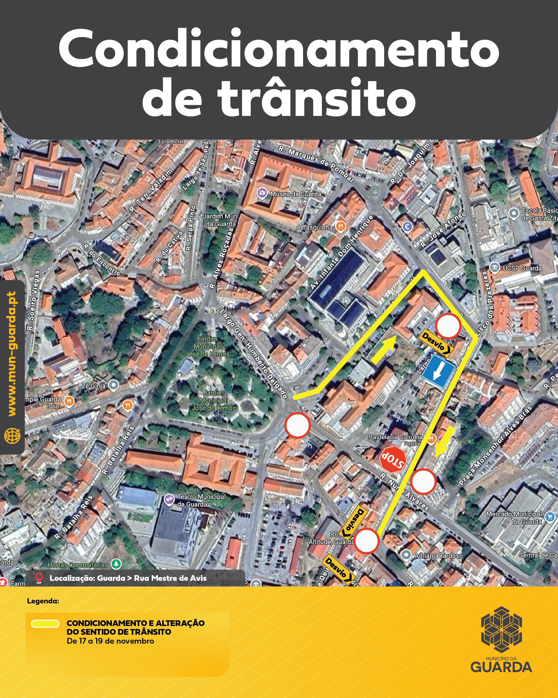 Aviso | Condicionamento e alteração do sentido de trânsito – de 17 a 19 de novembro | Várias Ruas - Guarda