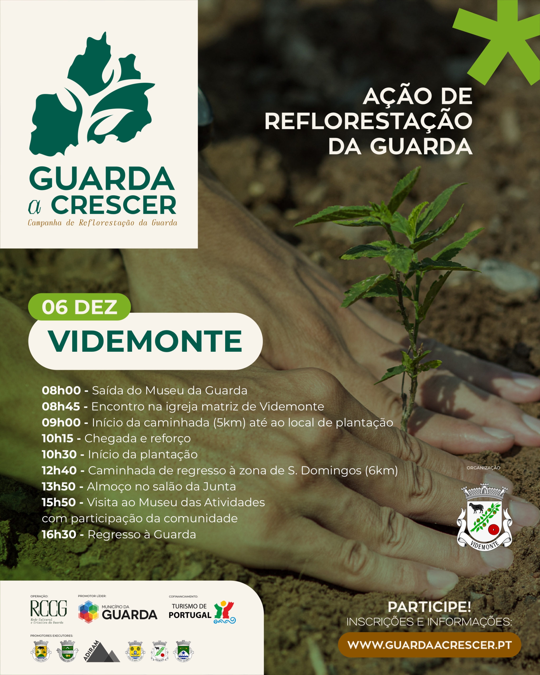 Para esta iniciativa, os promotores apelam à especial participação dos cidadãos e visitantes, turistas, associações e parceiros, essencial para recuperar e regenerar áreas afetadas pelos incêndios de 2022, naquele que é frequentemente designado de “pulmão da Guarda”. O programa deste dia é extenso e inclui caminhada de ida e regresso até ao local de plantação. Pessoas com menor mobilidade e resistência física poderão usar o transporte cedido pelo município entre o centro da aldeia e o terreno. Para o encerramento do Guarda a Crescer, haverá reforço e um almoço volante para todos os participantes.